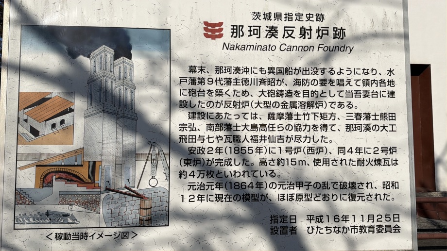 反射炉之建設也、其淵源遠在 烈公受封之初。公深憂海防不備、謂大砲非反射炉不能鋳、乃命執政下野氏、画其形製、聘薩摩藩士竹下矩方、諮問其法。嘉永中、築一炉於水戸、尋移之那珂湊、未成。